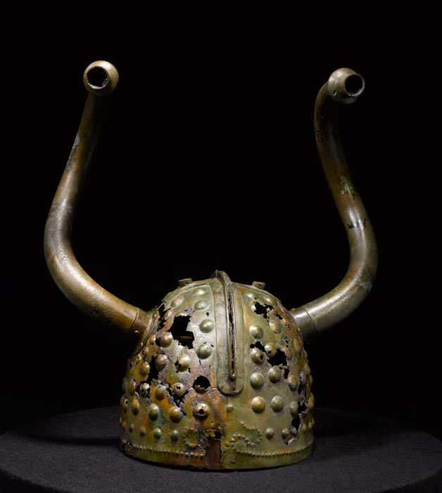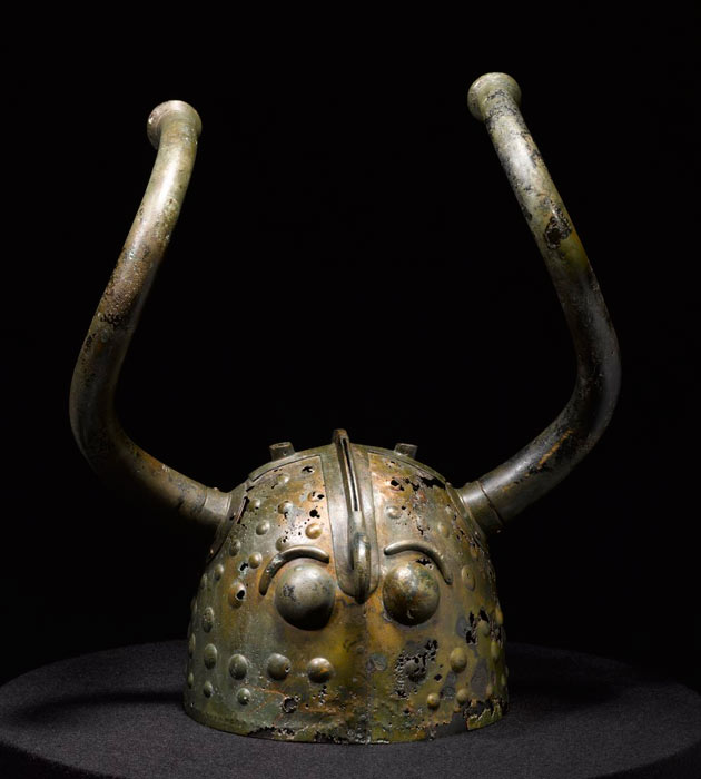 In 1942, a peat cutter digging in a Danish bog crunched his shovel into a horned bronze helmet. Long, curving bull’s horns topped a round cap adorned with the beak and large eyes of a bird of prey.