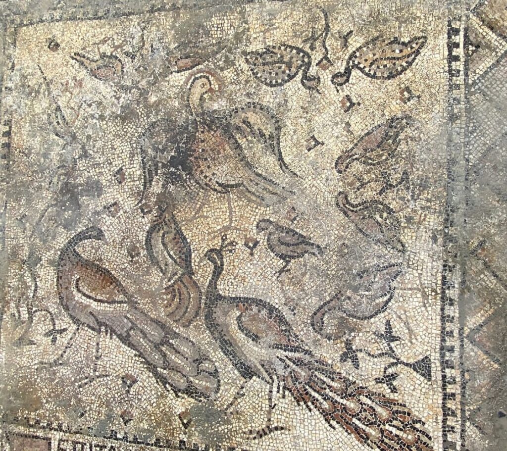 “During this year’s excavations at the church, another mosaic area was discovered. This mosaic made by a slave pictures peacocks and depictions of heaven.”
