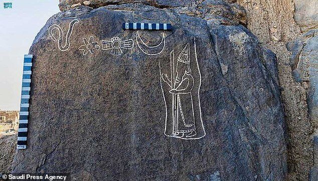 Discovered in Saudi Arabia, the inscription depicts king Nabonidus holding a scepter and surrounded by four religions symbols: a snake, a crescent moon, the sun and a flower.