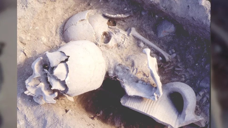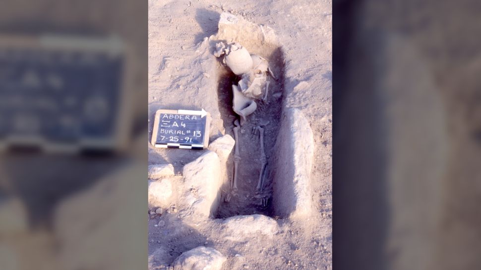 But the warrior wasn’t given his own grave; his head was interred in the pre-existing grave of a 5-year-old child, who was buried in the center of a 20-plot cemetery at Polystylon fort. A broken ceramic vessel, which may have been used to dig the hole for the warrior’s head, was uncovered at the burial, Agelarakis added.