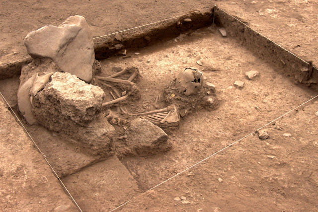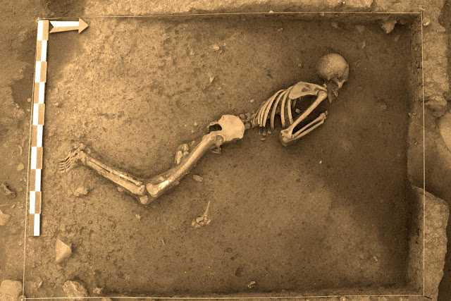 The complete skeleton of a young individual — lying on its side — was discovered in the second burial, located a few meters from the first one.