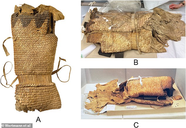 Researchers say the ‘light and highly efficient defensive garment’ was constructed with small inter-lapping pieces of leather that resemble ‘the scales of fish’.