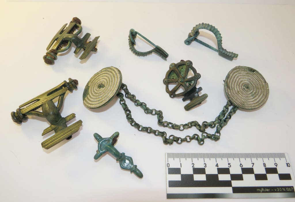Grave goods that have been discovered thus far include pottery, jewelry of bronze, silver and gold, fibulae in a wide variety of shapes and sizes, torques, bangles, belt buckles, amber beads, weapons and tools.
