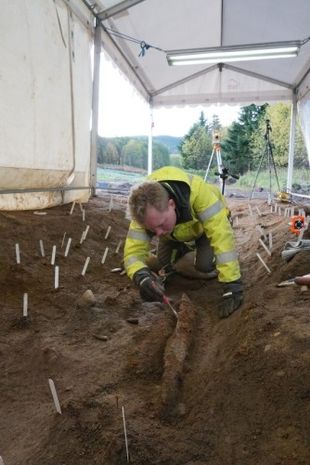 The burial was found in connection to highway upgrades, and work was immediately undertaken to excavate the site. It was in extremely poor condition, with the wood of both boats almost entirely rotted away. It was poor soil for bone preservation, too - not much was left of the dead, either.