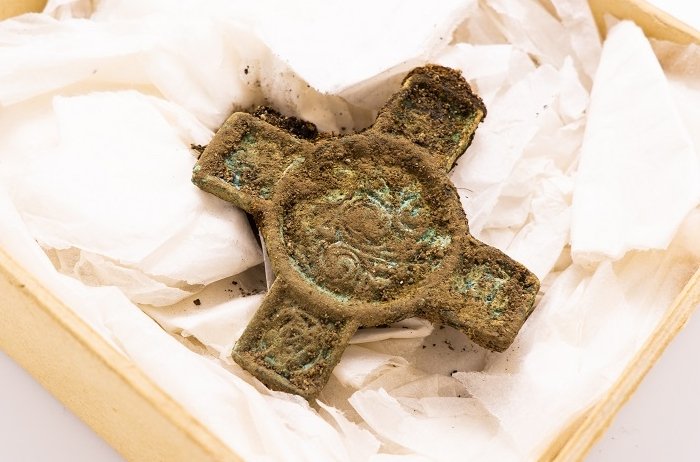 Of particular interest among the grave goods, the archaeologists said, was a cross-shaped brooch. Its shape and the pattern on its face suggest that it was once part of a horse harness made in Ireland.
